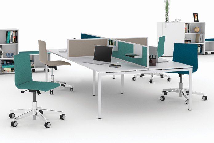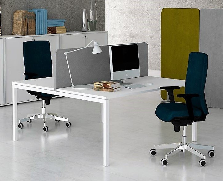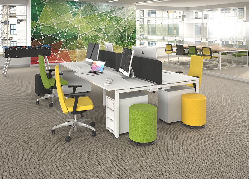 Sleek and minimal bench desk style workstations with fixed goal post legs.