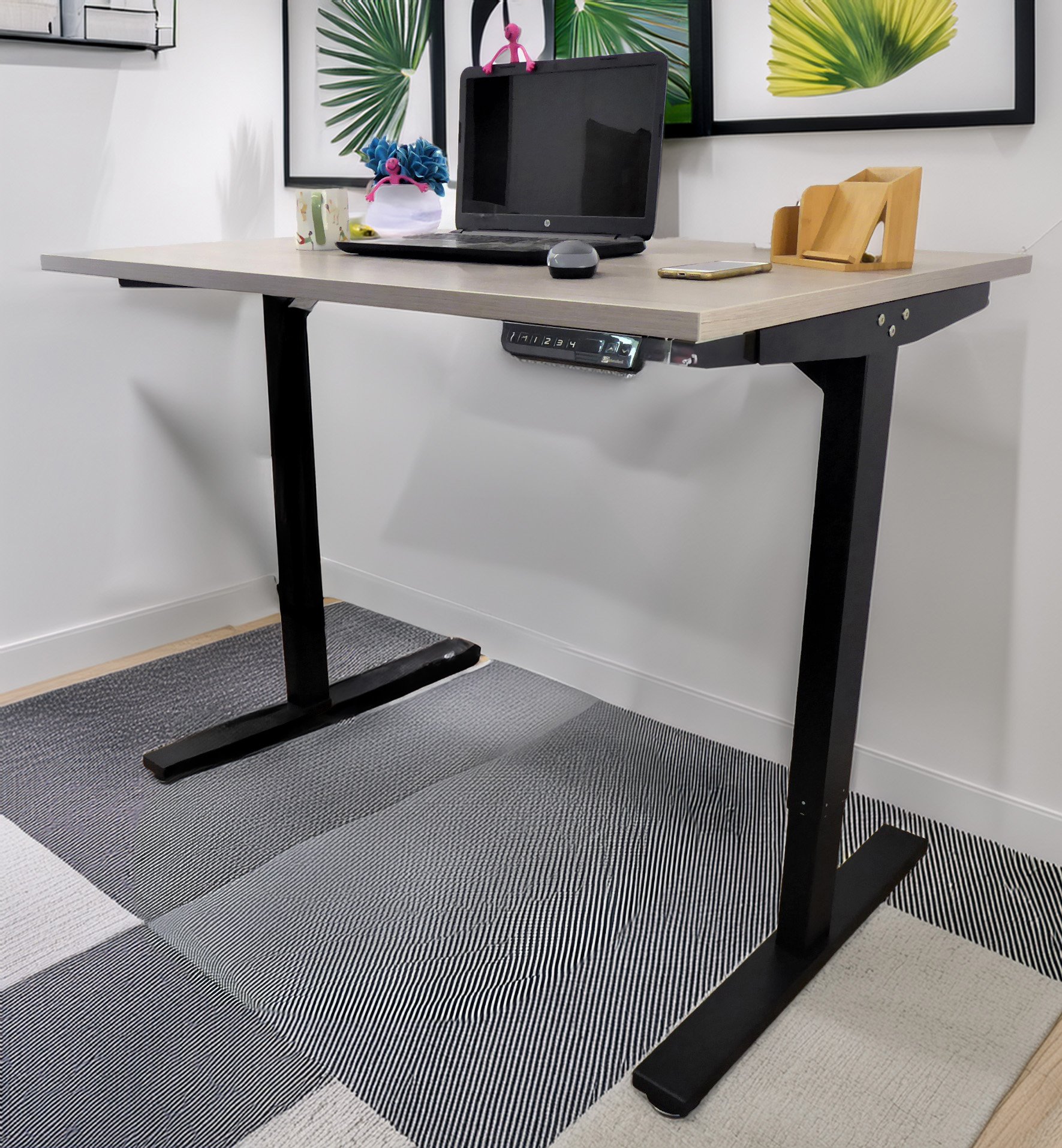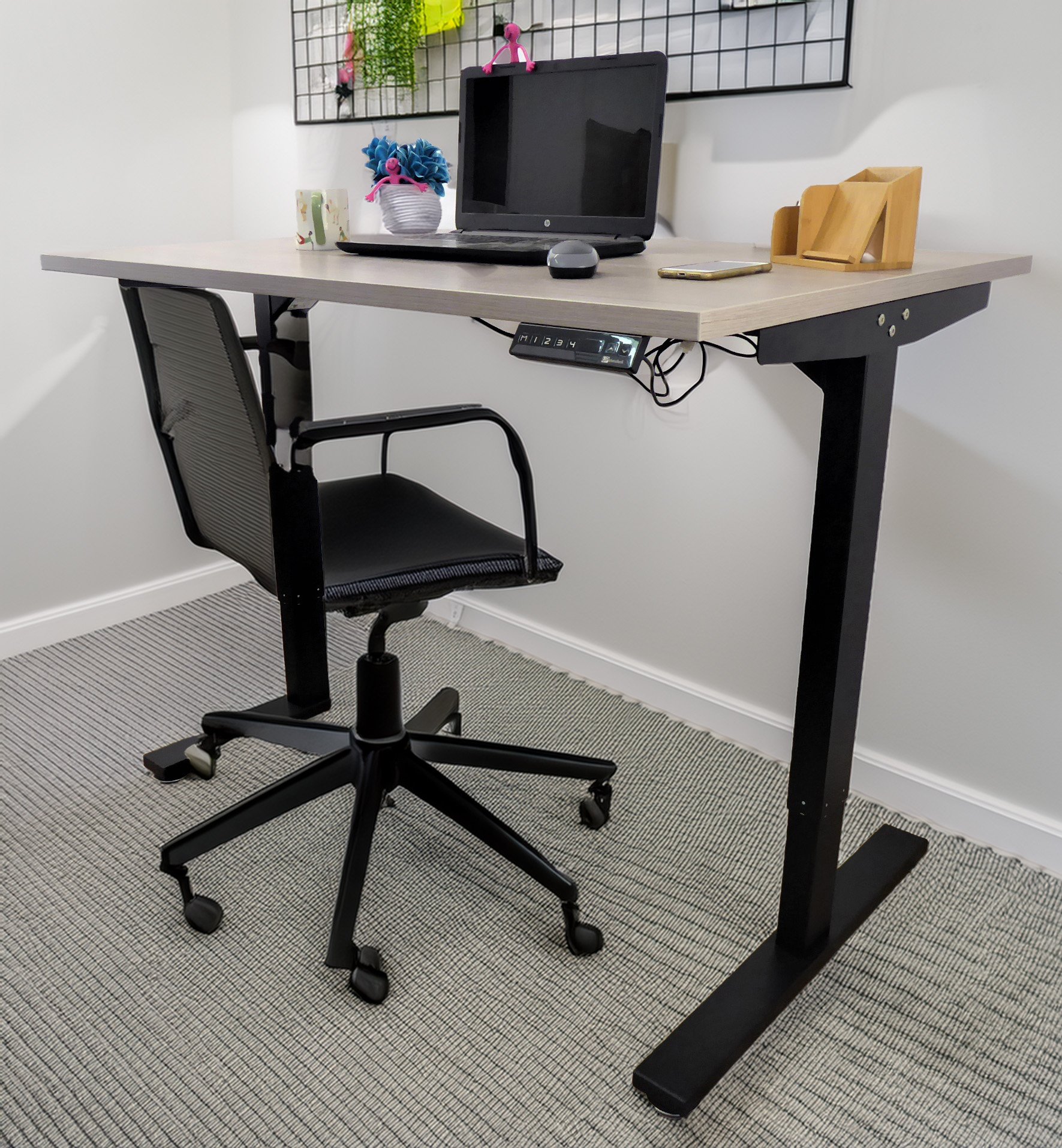 Choose from three frame colors—White, Black, or Grey—to match your office decor. The Wood Grey Standing Desk combines quality craftsmanship, thoughtful features, and elegant design. It’s an ideal choice for a stylish and functional work environment.